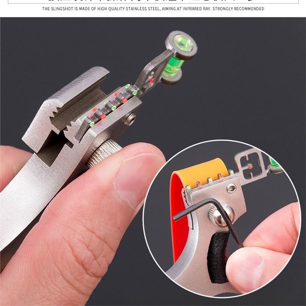 [Precise Aiming] This slingshot has red and green fiber optics to assist aiming, combined with a level to keep the position centered, allowing the red laser to better aim at the target.