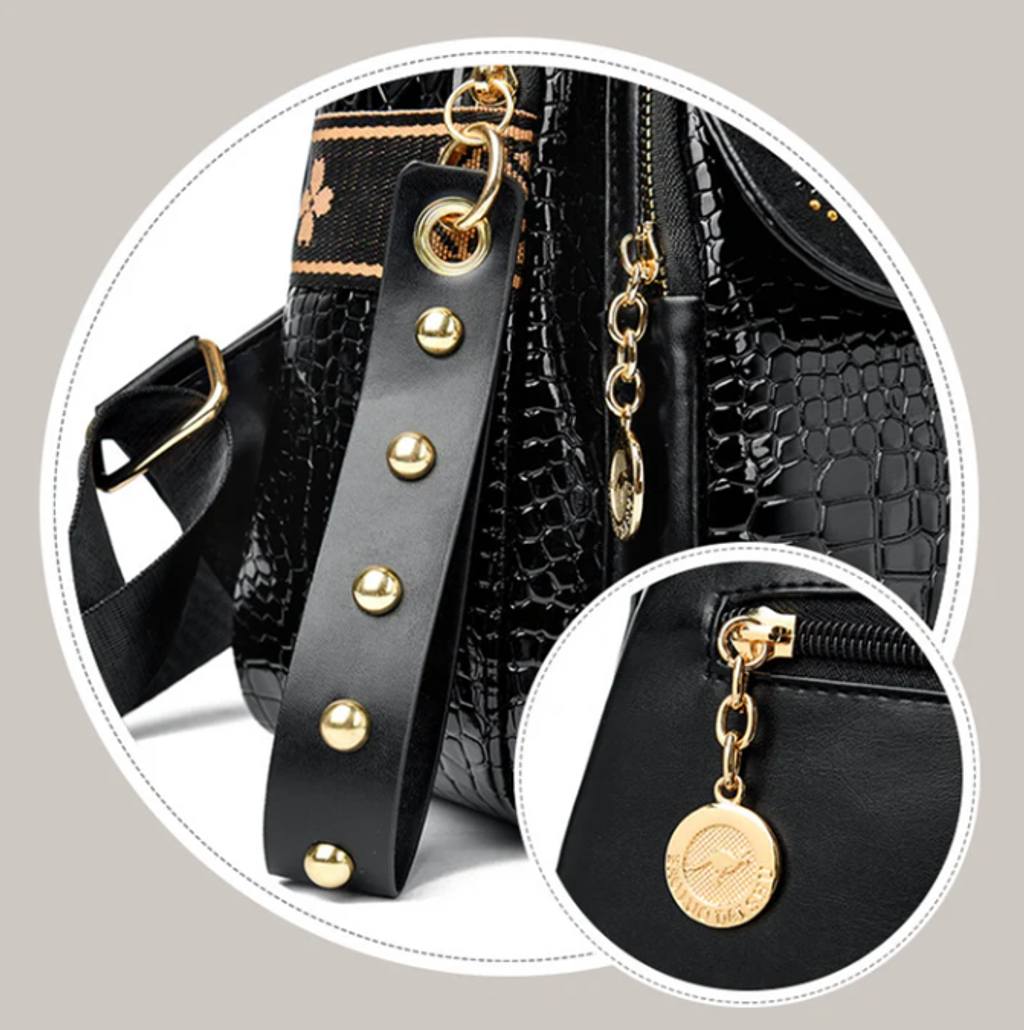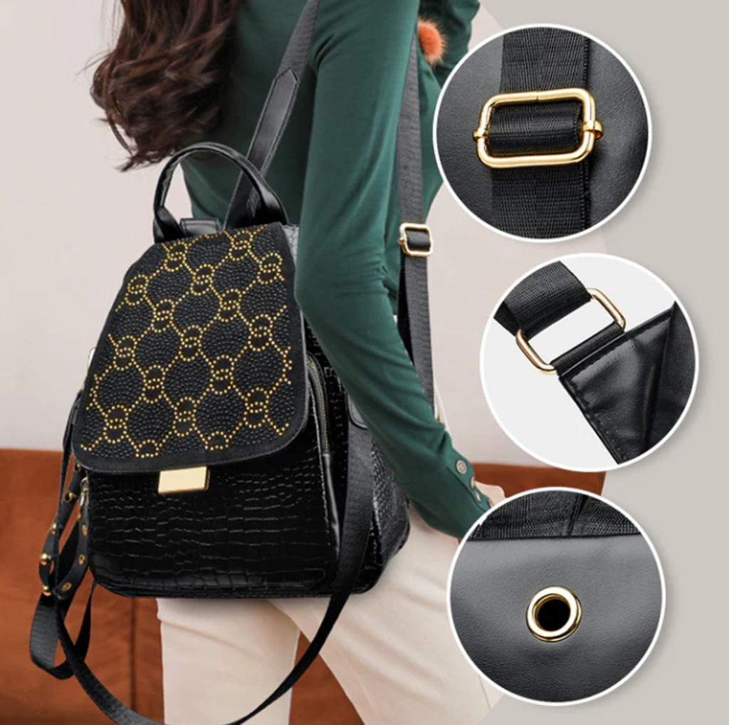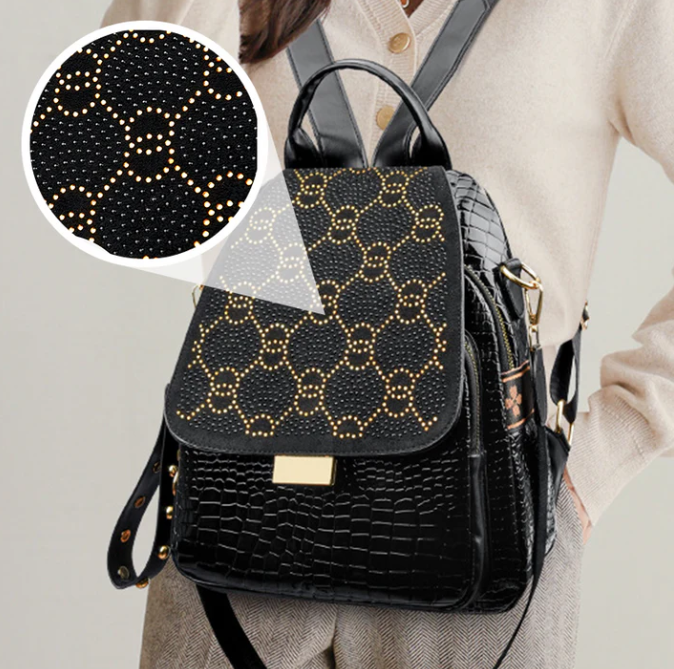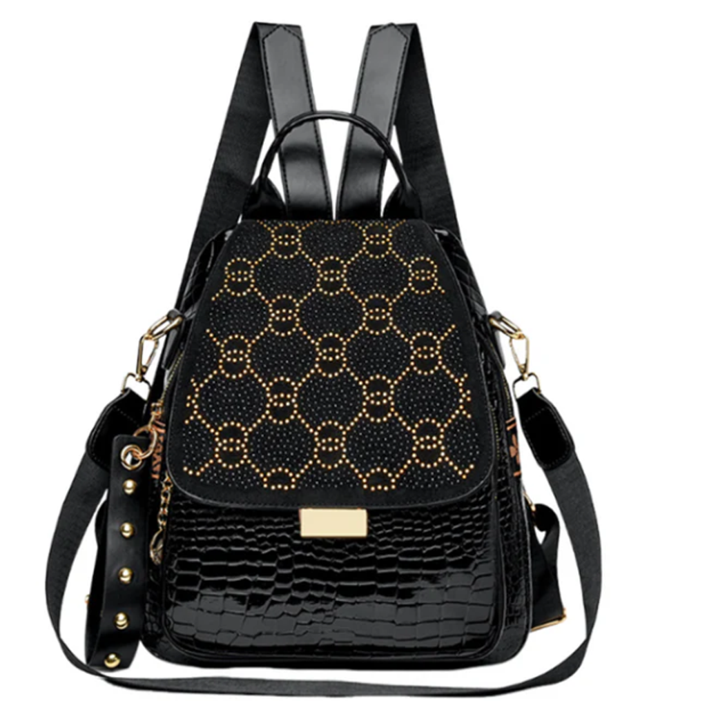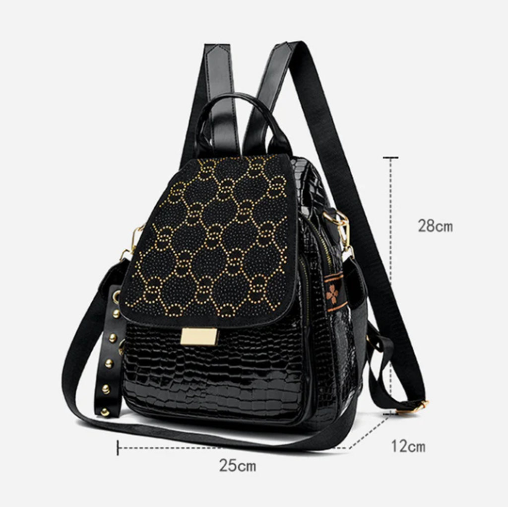 TRANSPORT NATURAL DATA IN STYLE WITH GLITTERING RHINESTONE ACCENTS - An elegant geometric print and sparkling crystal details elevate your everyday look, transforming a practical backpack into a fashion statement. Perfect for work, travel, or nights out, this bag transitions effortlessly from day to night while maintaining its luxurious aesthetic.